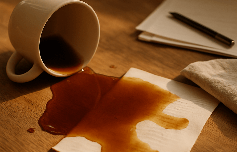 One quick bump of my elbow, and my mug tipped over. Coffee spilled across the table, dripping onto the floor, soaking into a stack of papers I’d left there.